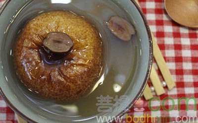 1、將梨洗淨,切成四瓣後挖去中間的芯,再將四瓣合起來用牙簽固定住,放入碗中,放入烤箱中200℃烤1小時,取出後拆去牙簽;