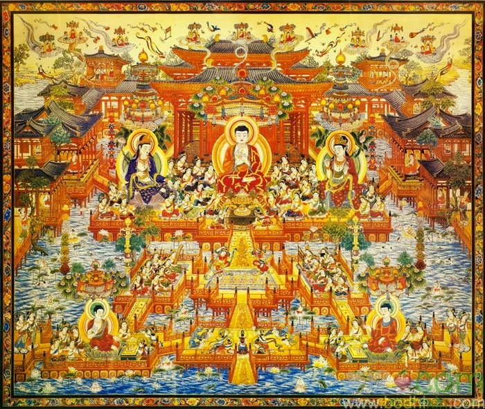 爾時,世尊告韋提希:“汝今知不?阿彌陀佛去此不遠。汝當繫念,諦觀彼國淨業成者。我今為汝廣説眾譬,亦令未來世一切凡夫欲修淨業者,得生西方極樂國土。欲生彼國者,當修三福:一者、孝養父母,奉事師長,慈心不殺,修十善業;二者、受持三歸,具足眾戒,不犯威儀;三者、發菩提心,深信因果,讀誦大乘,勸進行者。如此三事,名為淨業。”