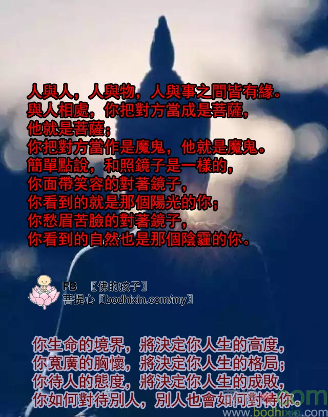 你怎樣對待別人,別人也會怎樣對待你,不要總是怨天尤人,不要總是挑別人的毛病,看別人不順眼,不要總想去改變別人,先調整好自己的心態,修好自己的心,一切境都會隨心轉。