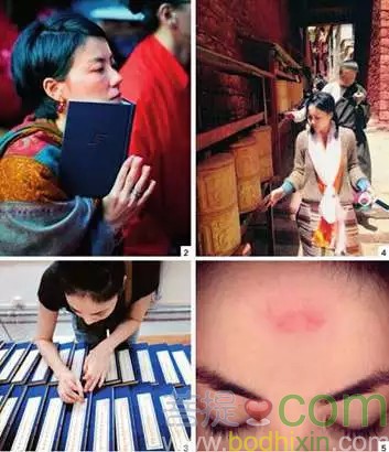左上:王菲赴印度拜佛。左下:2013年,王菲鈐印經書。右上:2013年,王菲在西藏轉經。右下:2013年,王菲額頭上疑似磕頭留下的紅印。