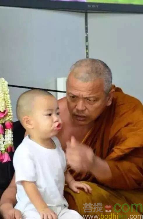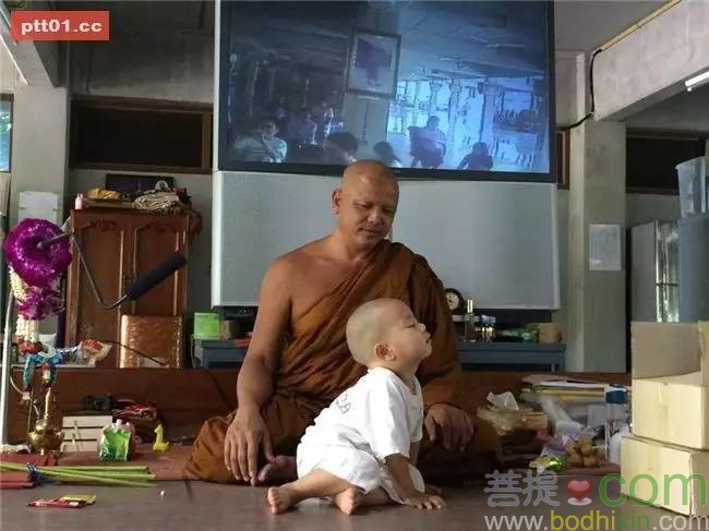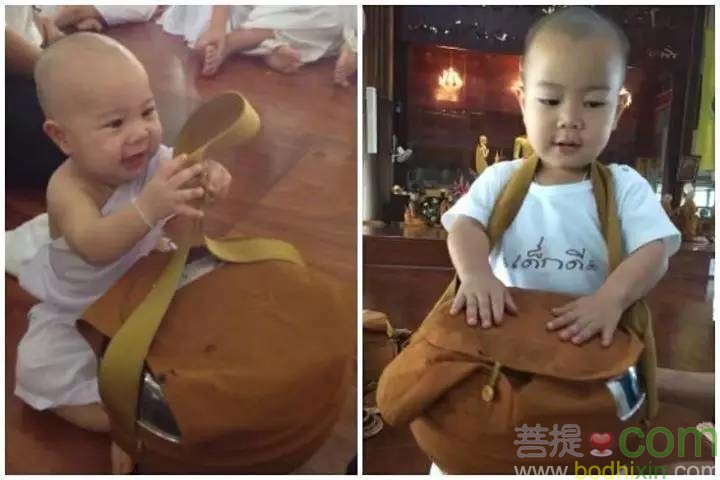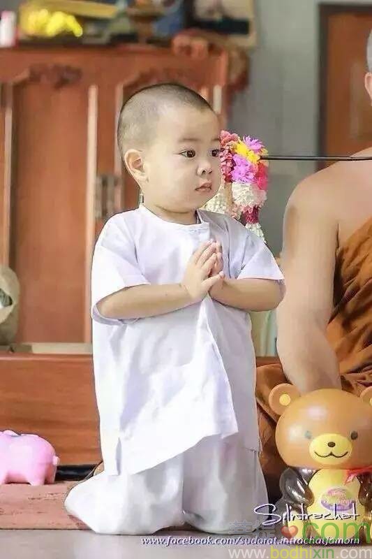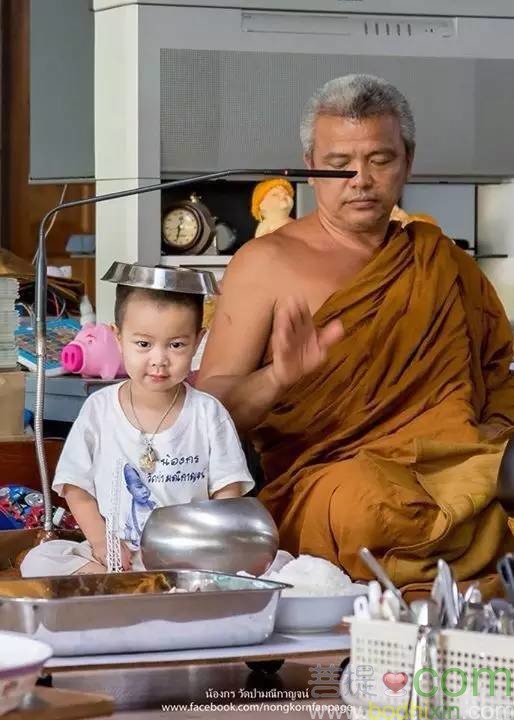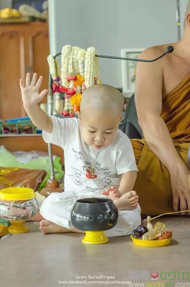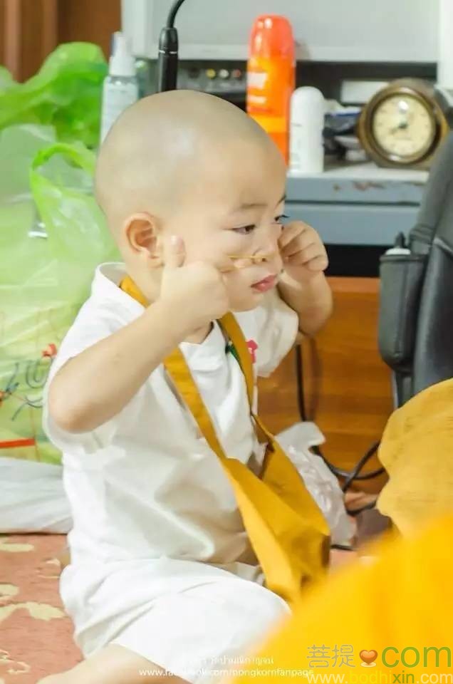 這個呆萌的小baby名字叫 Nongkorn ,今年才剛剛2歲半,但已經是泰國暖武里府寺廟裡非常有名的小沙彌了。他從3個月大的時候就開始接觸佛法,到了上幼兒園的年紀,就被父母送來當了小和尚,每天跟著寺裡的師傅們打坐、念經、化緣。