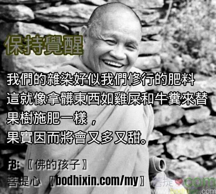 我們的雜染好似我們修行的肥料。這就像拿髒東西如雞屎和牛糞來替果樹施肥一樣,果實因而將會又多又甜一樣。在痛苦中有快樂;困惑中有平靜。若能運用熟練的話,雜染是非常有用的。就好像拿雞或牛的糞便放入土壤裡來助長木瓜樹。例如:當疑惑升起時,注視著它,當下審查,這樣做將幫助你的修行成長,而且結出甜美的果實。